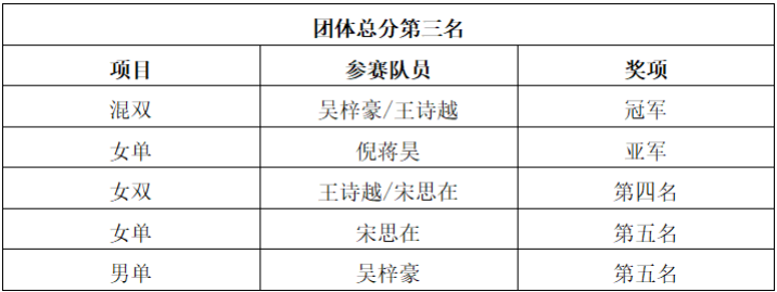 校羽毛球队自2024年10月组队,在备赛时间有限,参赛人数和参赛项目均不占优势的情况下,教练员戴磊老师针对本届比赛,立足参赛队员的特点制定了科学的训练计划,并组织全体队员利用课余时间全身心投入训练。比赛中,各参赛队员不畏强手,奋力拼搏,充分展示了自身的技战术水平和我校学子青春向上的精神风貌。