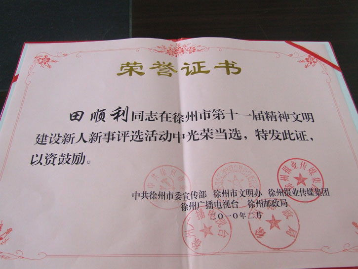2009年底田顺利同学获得了“‘感动矿大’2009校园十佳大学生”荣誉称号,这次他又以唯一在校大学生的身份获得徐州市精神文明建设的新人新事荣誉,这不仅是对田顺利同学的充分肯定,也充分展示了矿大学子的优秀品质,展示了当代大学生的良好精神风貌。